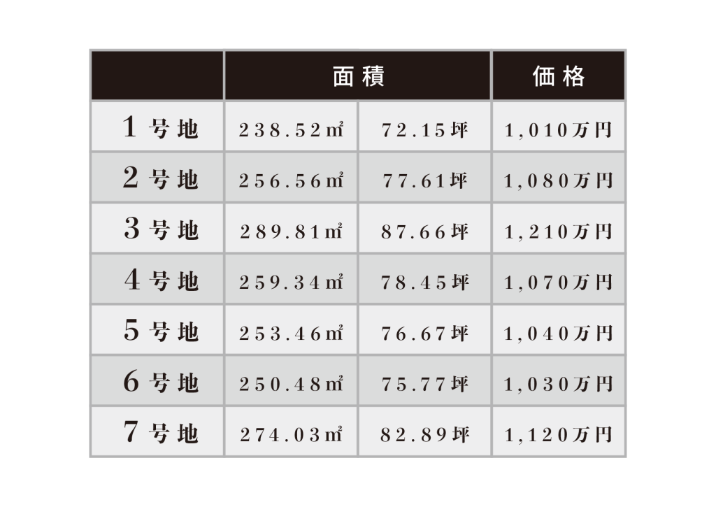 ※分譲面積は計画面積であるため、確定測量の結果増減する場合がございます。増減した場合は、それに合わせて売買金額も増減いたします。(坪表示は面積・価格とも参考表示です)
