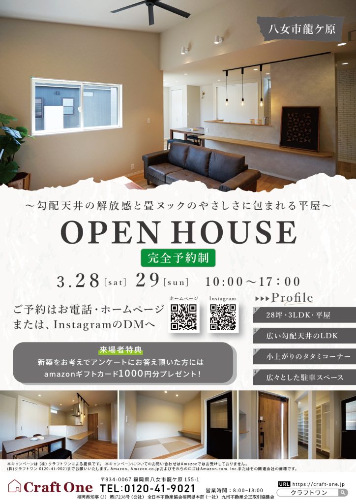 八女市に完成した「勾配天井の解放感と畳ヌックのやさしさに包まれる平屋」の完成内覧会を行います!
