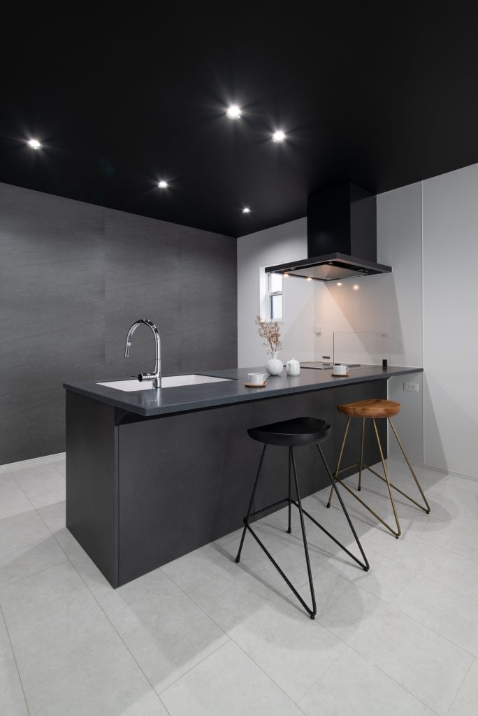 ブラックのキッチンに合わせ、天井と背面の壁紙も黒系で統一しました♪
