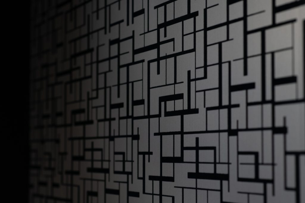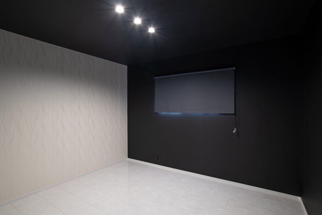 寝室はブラックの壁紙に、ホワイトのやわらかな模様のアクセントクロスがほどよい抜け感をプラス。スタイリッシュな印象のお部屋です。