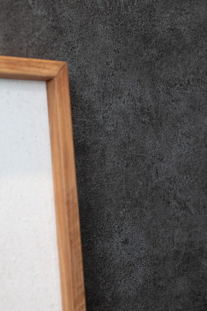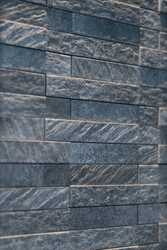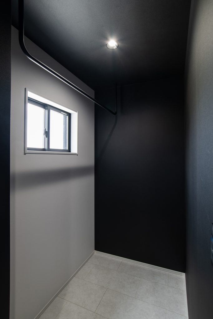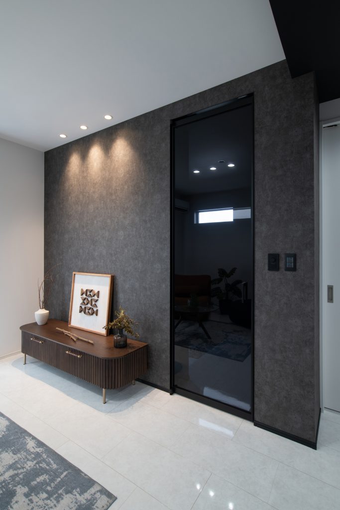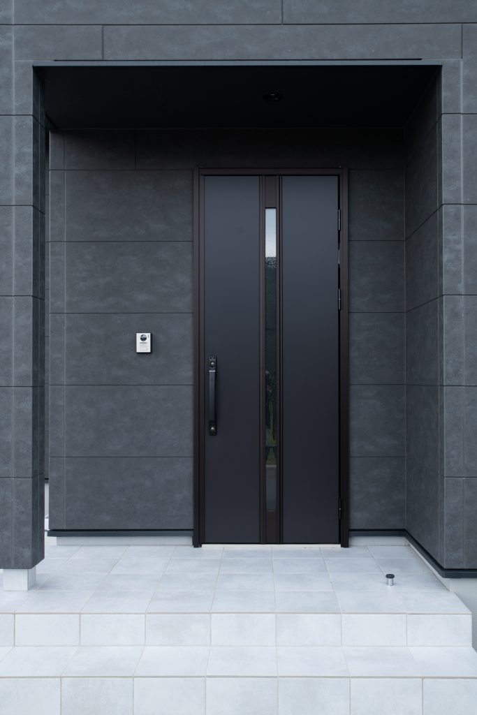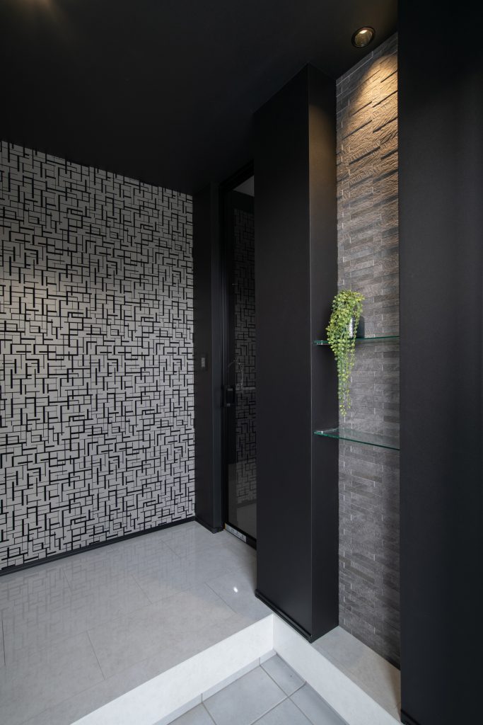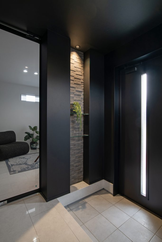 玄関周りはライトグレーのタイルにブラックの扉が際立ち、美しいコントラストを生み出しています。