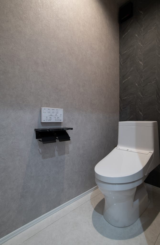 トイレはリアルな石目の層をデザインした背面のアクセントクロスが、上質な雰囲気を演出しています。
