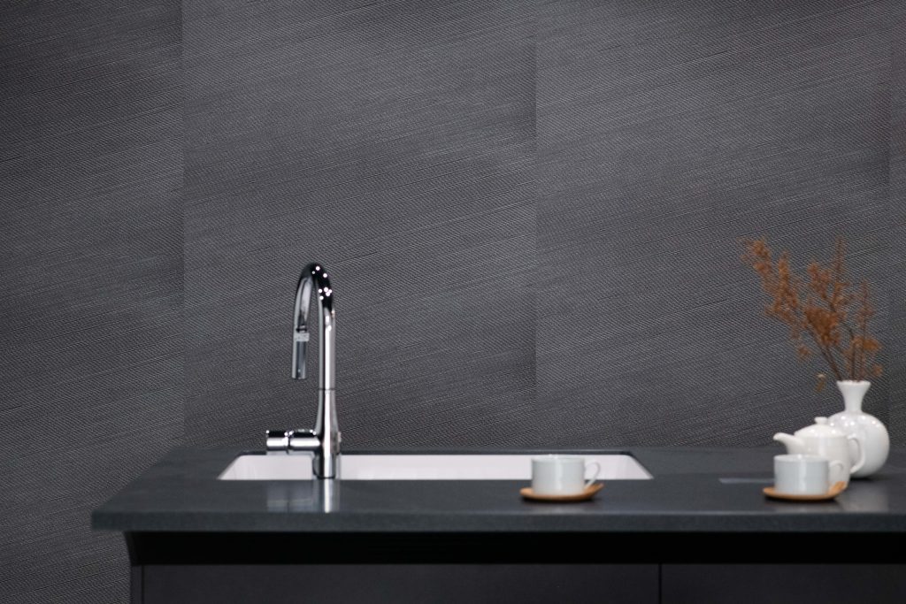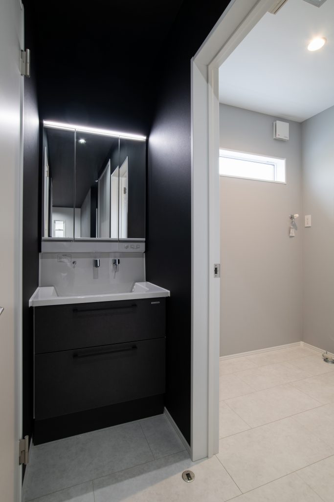 洗面台は収納扉から周囲の壁紙まで黒で統一されていて、クールな印象でおしゃれです♪