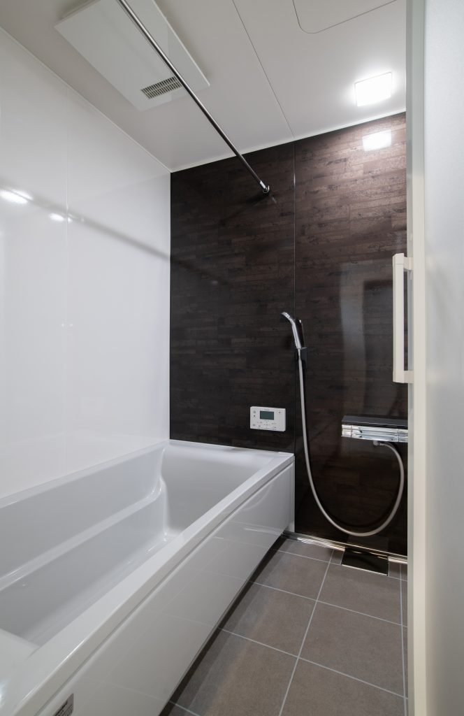 バスルームはダークブラウンのアクセントパネルを使用していて、落ち着きと温かみのある空間で