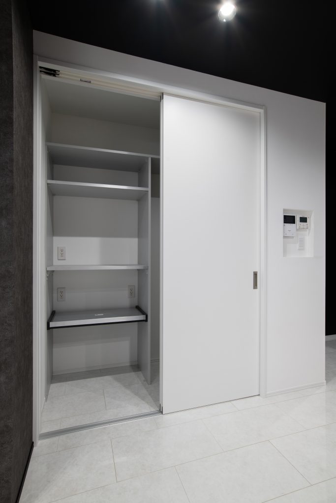 LDK内には扉付き収納を設けており、生活感を隠しながら空間を美しく保てます。