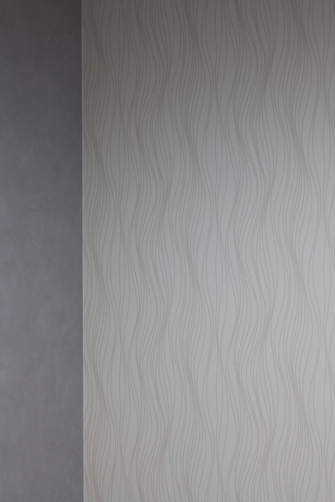 寝室の隣にはグレーの壁紙とホワイトのアクセントクロスを組み合わせた上品な雰囲気の洋室があります。